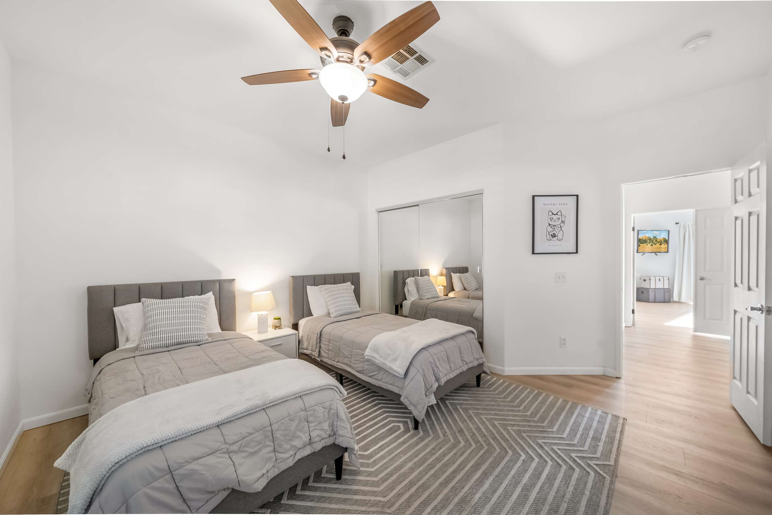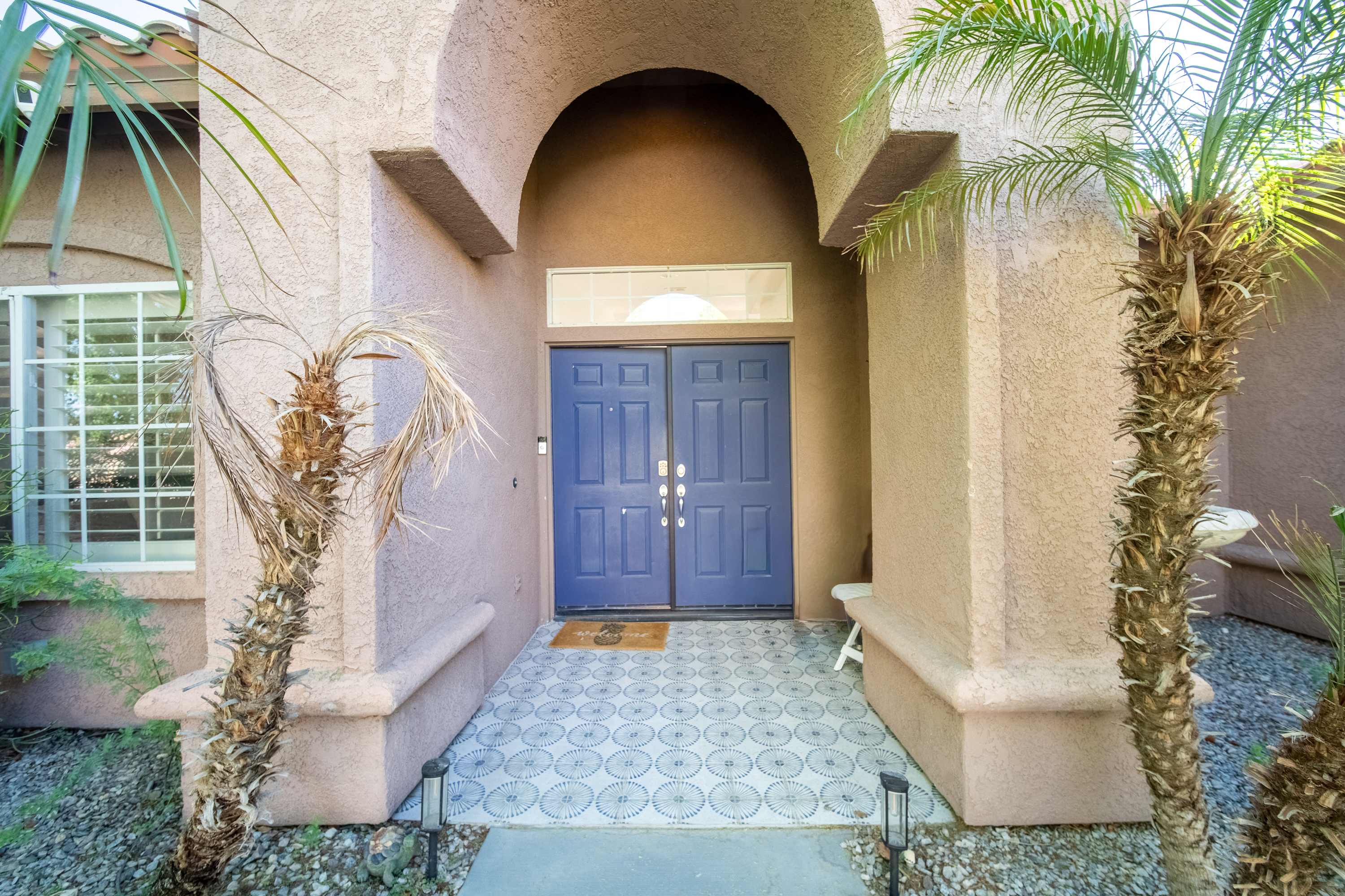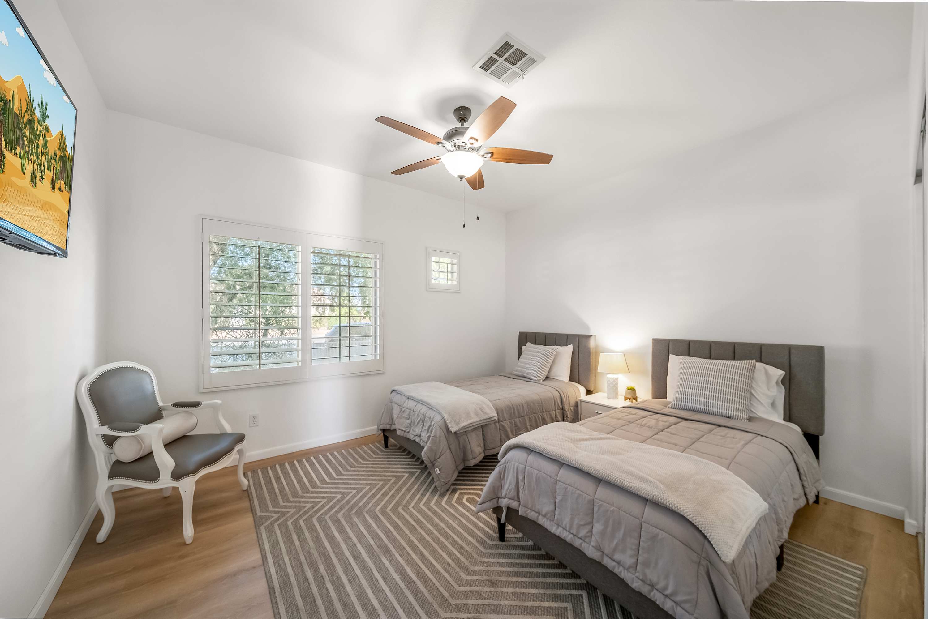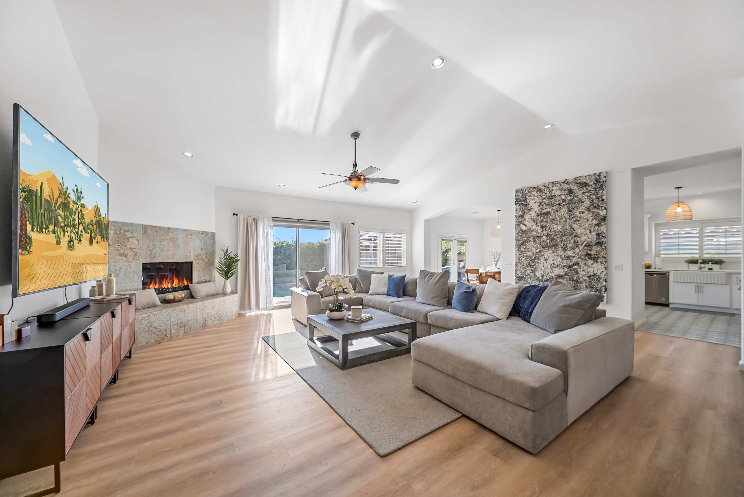 Step through double entry doors into an open-concept great room with soaring ceilings, recessed lighting, and a welcoming living area. The remodeled kitchen boasts a large island, quartz countertops, modern appliances, and both a breakfast bar and formal dining area. The Primary Suite offers a walk-in closet, soaking tub, separate shower, and dual vanity. Two additional bedrooms provide flexibility for family, guests, or office use. Sleeping arrangements include a King bed, a Queen bed, and two Twin beds that can be combined to form an additional King if preferred. Outdoors, enjoy a landscaped backyard with a sparkling pool and spa — perfect for relaxing or entertaining — all framed by stunning desert mountain views. A covered patio, spacious lawn, and two bikes available for guest use complete the oasis feel.