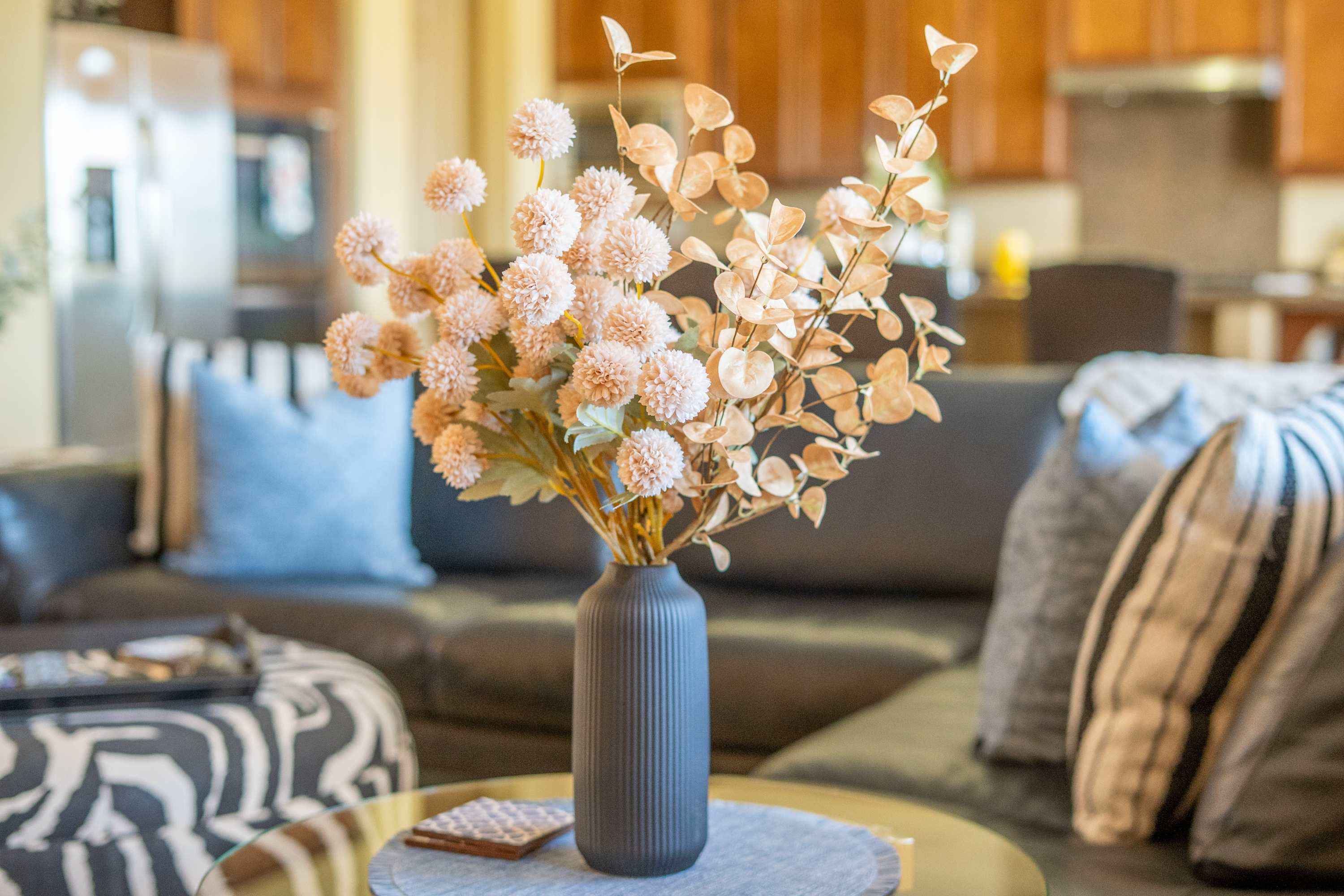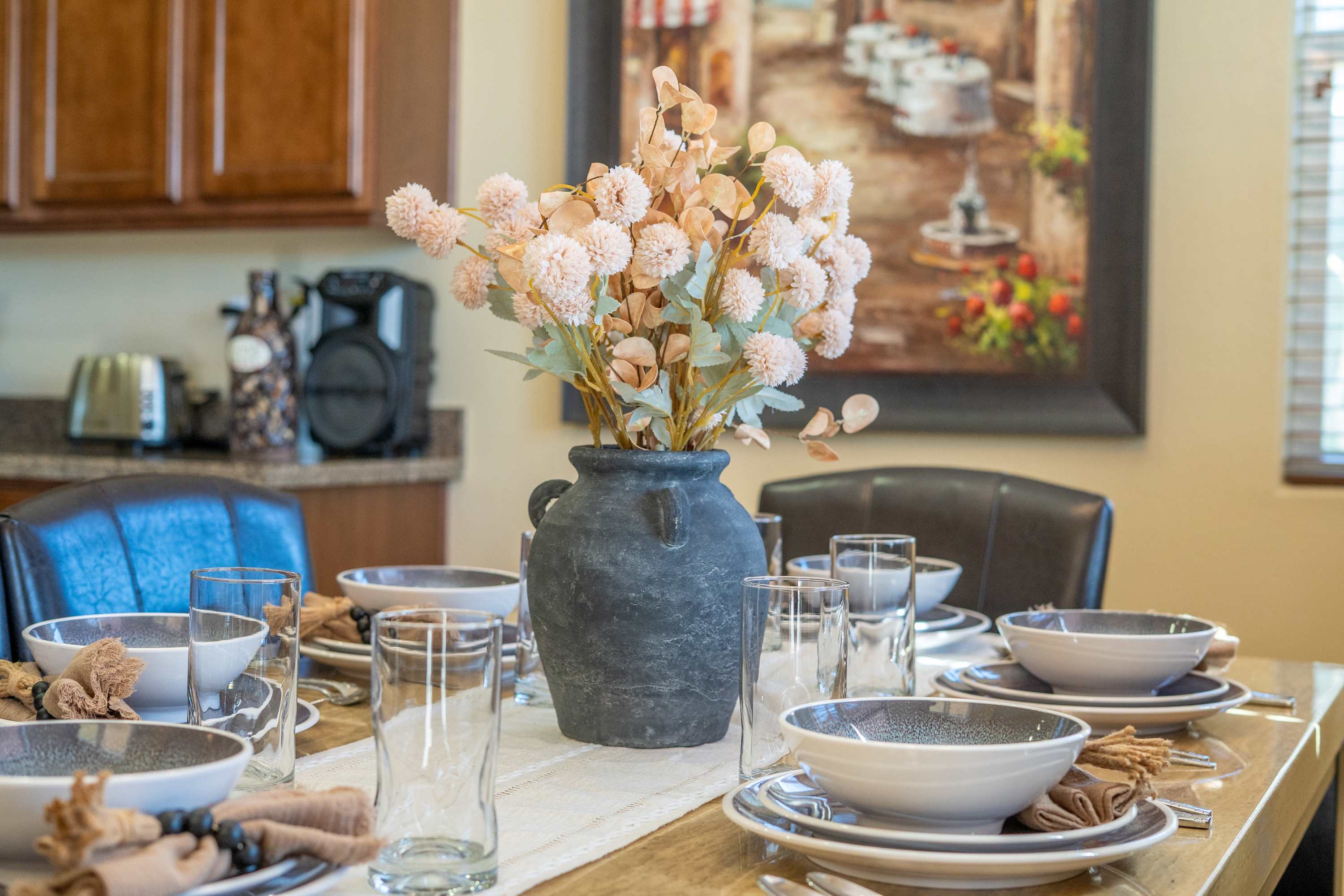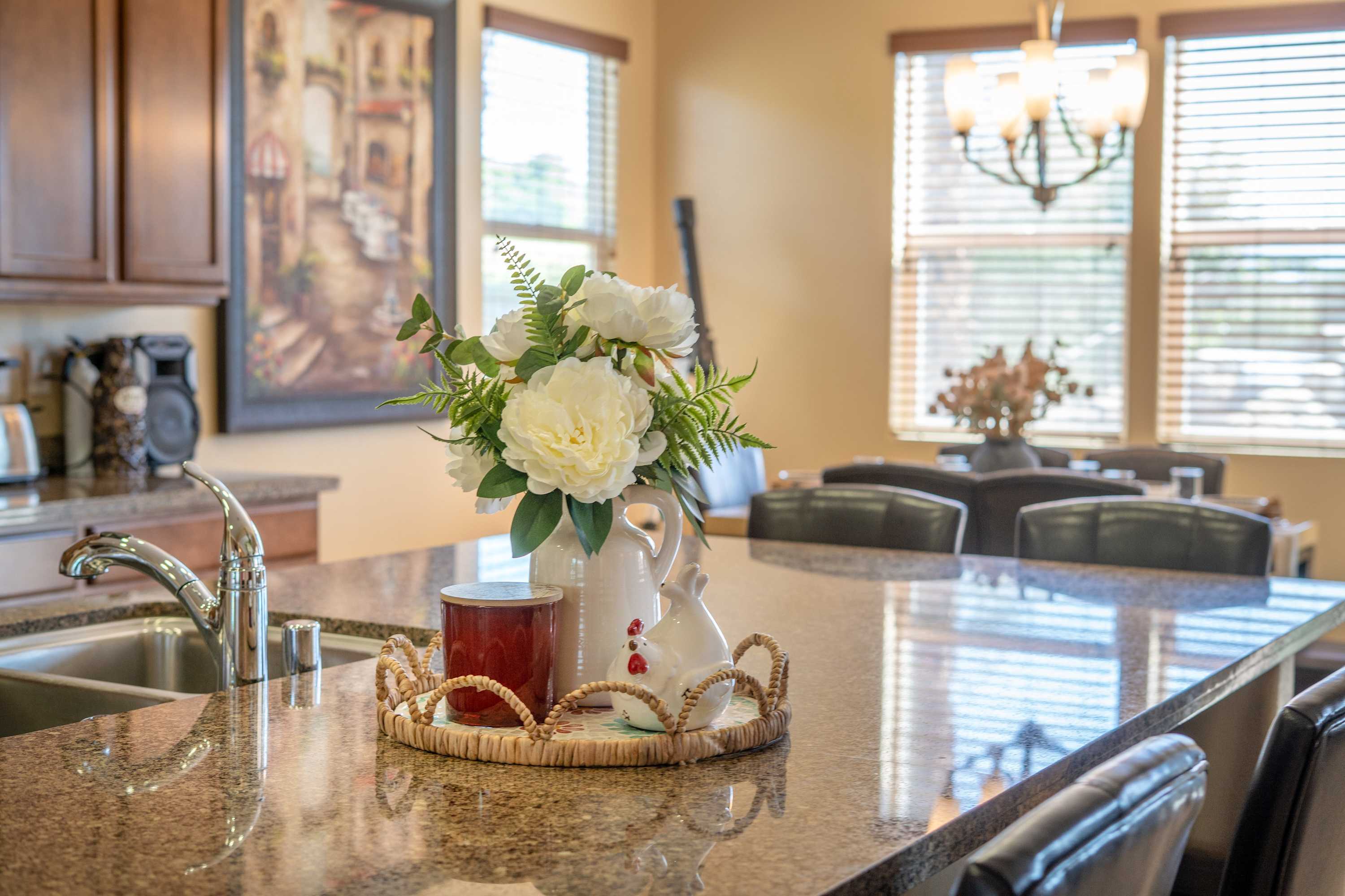 Step inside nearly 2,900 square feet of thoughtfully designed interiors, where natural light, soft desert tones, and curated furnishings create a calm, comfortable flow. The open-concept main living area features a large sectional, smart TV, and direct access to the backyard — perfect for relaxed evenings or casual entertaining. A formal dining area welcomes shared meals, while the cozy breakfast nook is made for slow mornings and coffee refills. The kitchen is warm and welcoming, with granite countertops, stainless steel appliances, generous cabinetry, and a large island that makes both cooking and hosting a breeze. The home features three comfortable bedrooms, thoughtfully arranged to accommodate families, couples, or long-term guests with ease. The spacious primary suite includes a king bed, smart TV, and a beautifully designed en-suite bath with dual vanities, a soaking tub, and walk-in shower. Two additional guest rooms — one with a queen bed and the other with twin beds — offer flexible sleeping arrangements in well-lit, stylish settings. Two full bathrooms and a convenient powder room serve the home, all appointed with modern fixtures and a warm, clean aesthetic. A separate laundry room with washer and dryer adds to the home's long-stay appeal. For indoor recreation, Casa de Nina features a dedicated game / living area with a classic-style pinball machine and foosball table, along with bar-height seating — a perfect bonus space for unwinding or entertaining. Outdoors, a private saltwater pool and raised spa take center stage, framed by swaying palms, mountain views, and desert landscaping. The covered patio includes a built-in BBQ grill, shaded dining space, and multiple seating areas — perfect for sunset meals, sun-soaked afternoons, or quiet evenings under the stars.