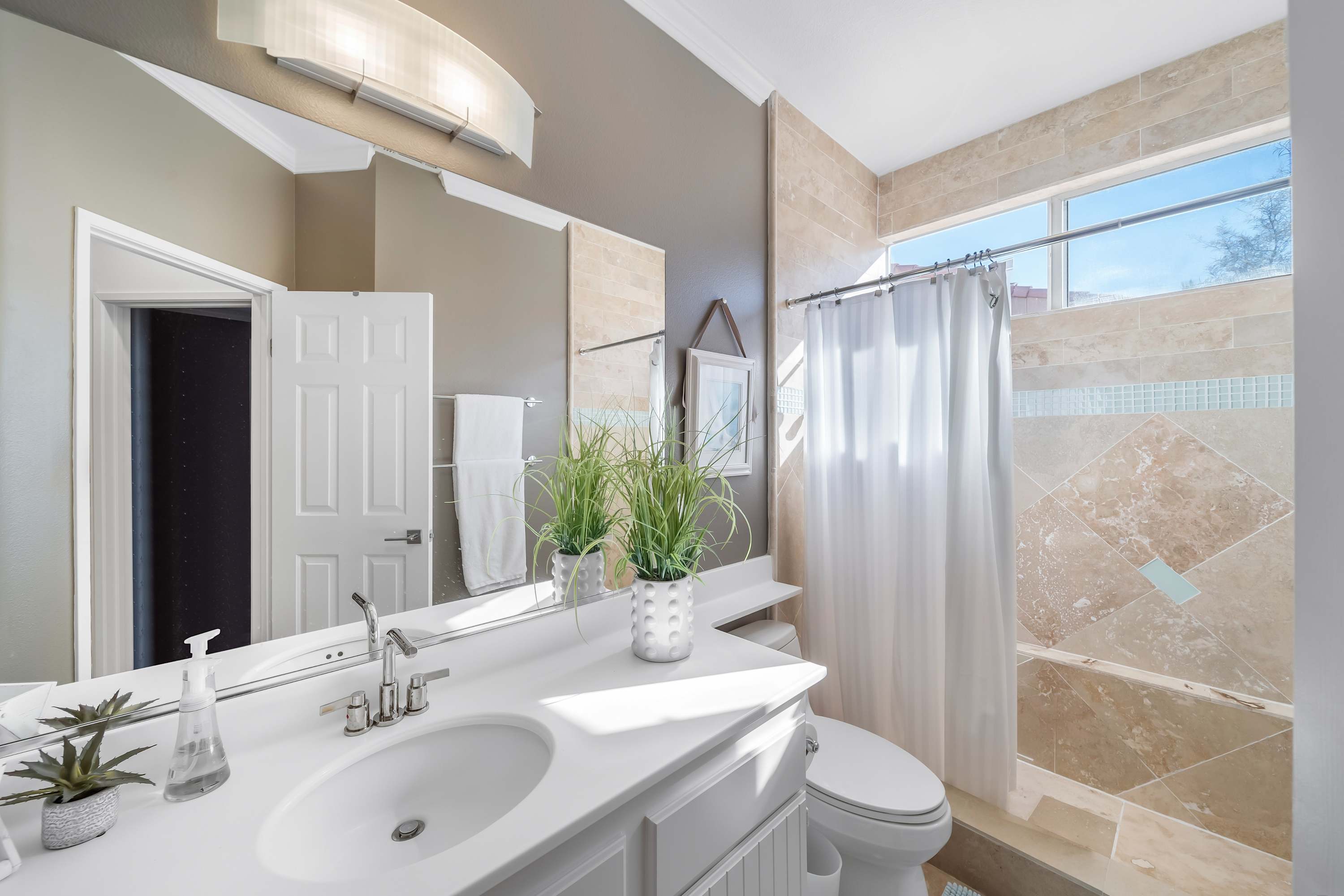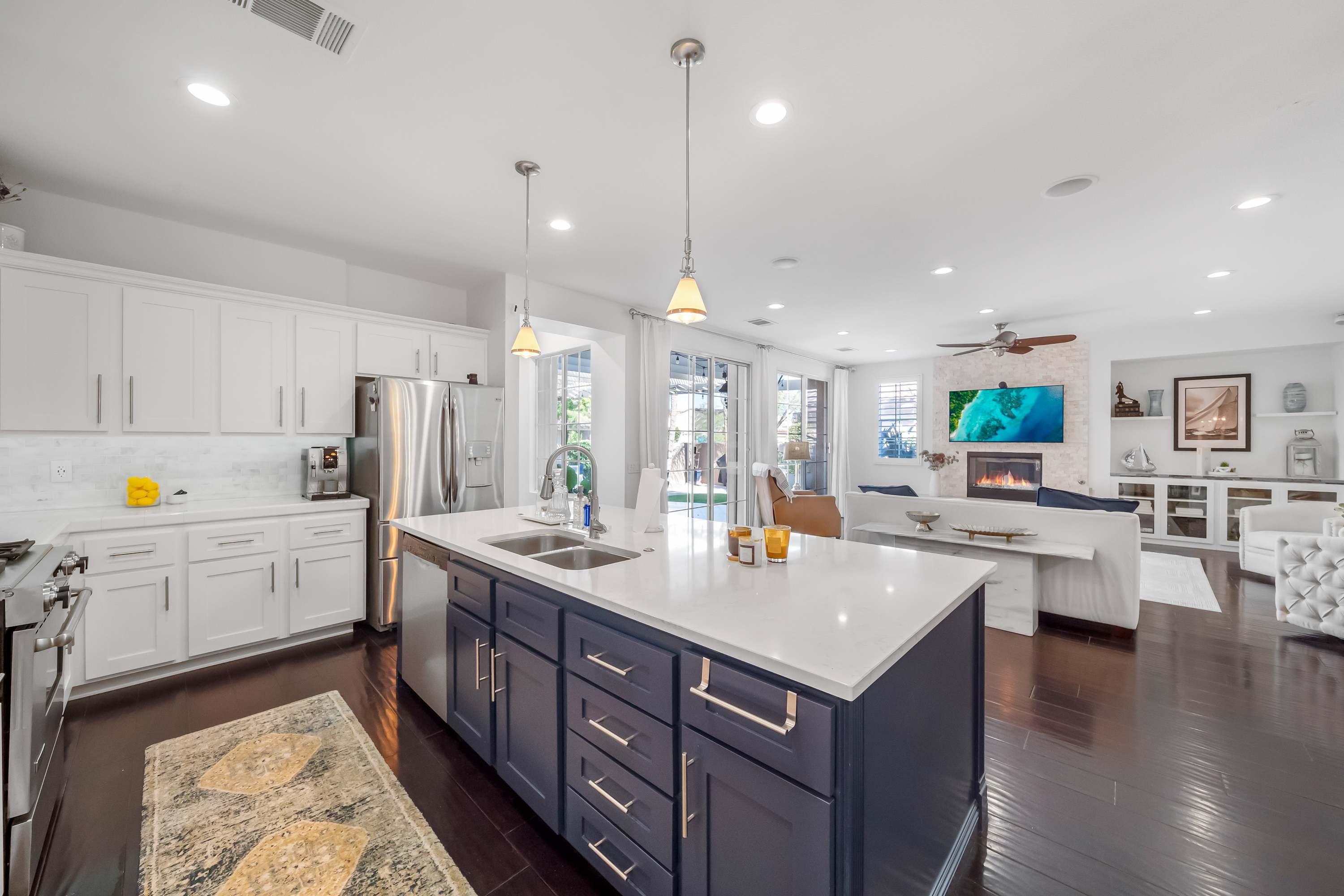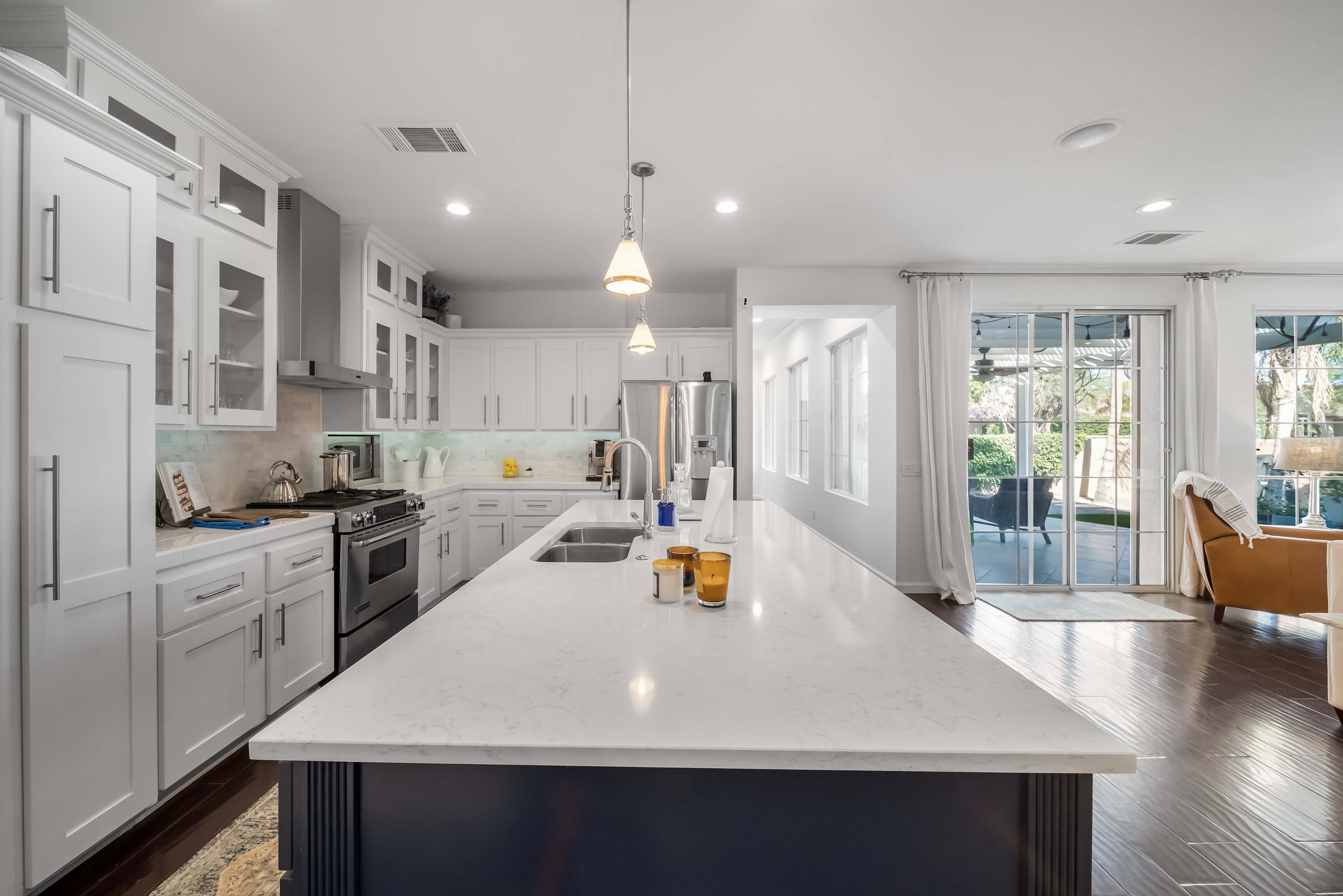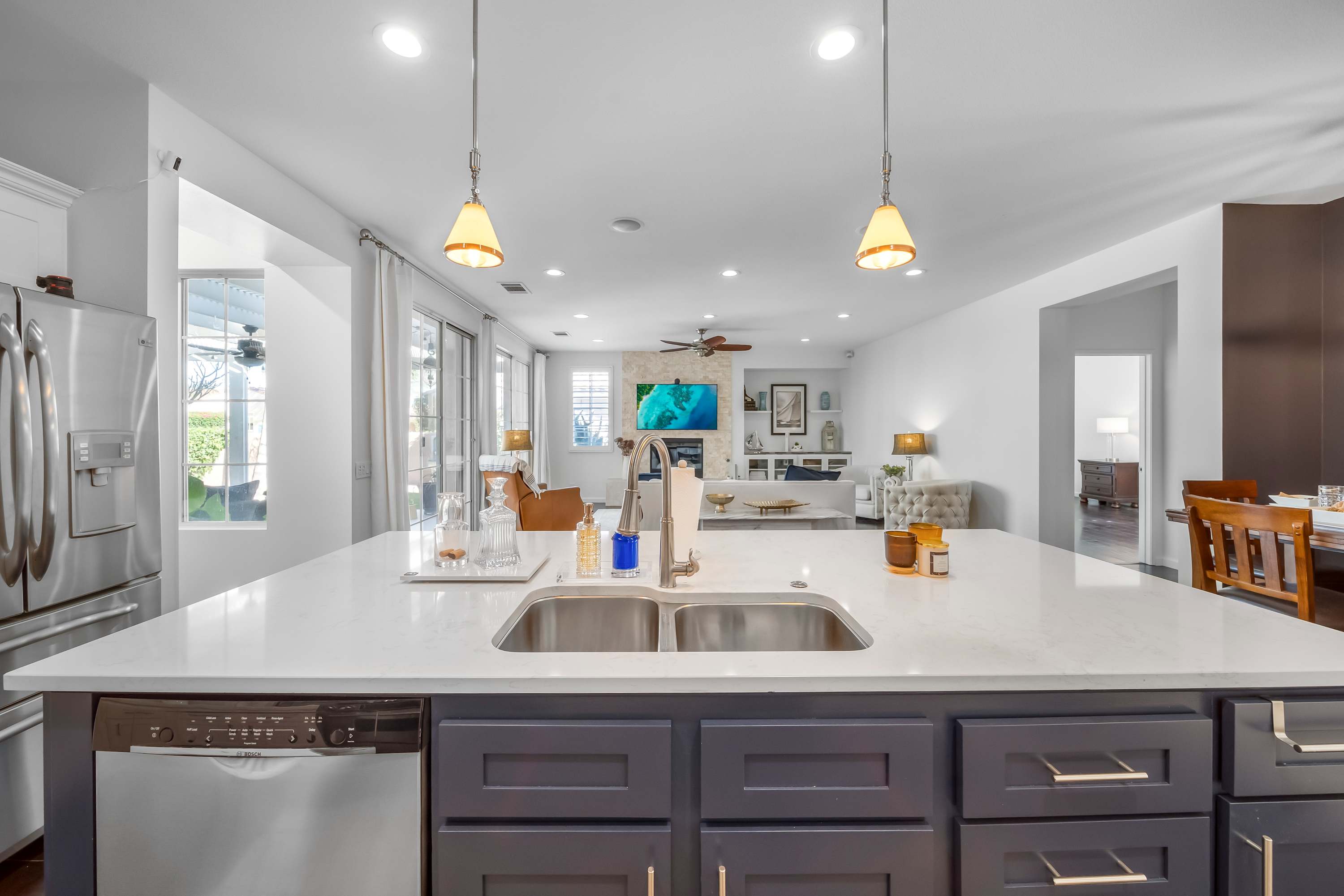 Casa Clara designed to feel open, clean, and easy to live in from the moment you walk in. The home features wide-plank wood-style flooring throughout the main living areas, giving it a modern, seamless look while also being easy to maintain for longer stays. Natural light fills the space during the day, and the layout flows effortlessly from the kitchen into the living areas. The kitchen is one of the highlights, with quartz countertops, white shaker cabinetry, and a large center island with seating. Whether you’re cooking, working from the island, or just having coffee in the morning, the space feels connected and functional. There are two separate living areas, including a main family room with a fireplace and a second sitting space near the entry. This makes it easy to spread out—whether you’re relaxing, working remotely, or hosting. Each bedroom is comfortably sized and finished with plantation shutters and ceiling fans, creating a calm and private space to unwind. The bathrooms have been updated with modern vanities and clean finishes, keeping everything simple and fresh. Step outside to a covered patio with ceiling fans and multiple seating areas. It’s a great spot to start the day or wind down in the evening, with a backyard that’s actually usable—not just for looks. Overall, the home is set up for real, everyday living—clean, functional, and thoughtfully updated without feeling overdone.